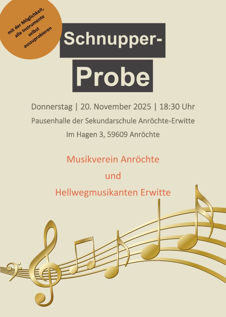 Dann besuch uns bei einer Probe, donnerstags, 19.30 Uhr in der Pausenhalle der Sekundarschule. Bitte melde dich vorher per E-Mail an musikverein.anroechte@gmail.com oder über unser Kontaktformular an.
